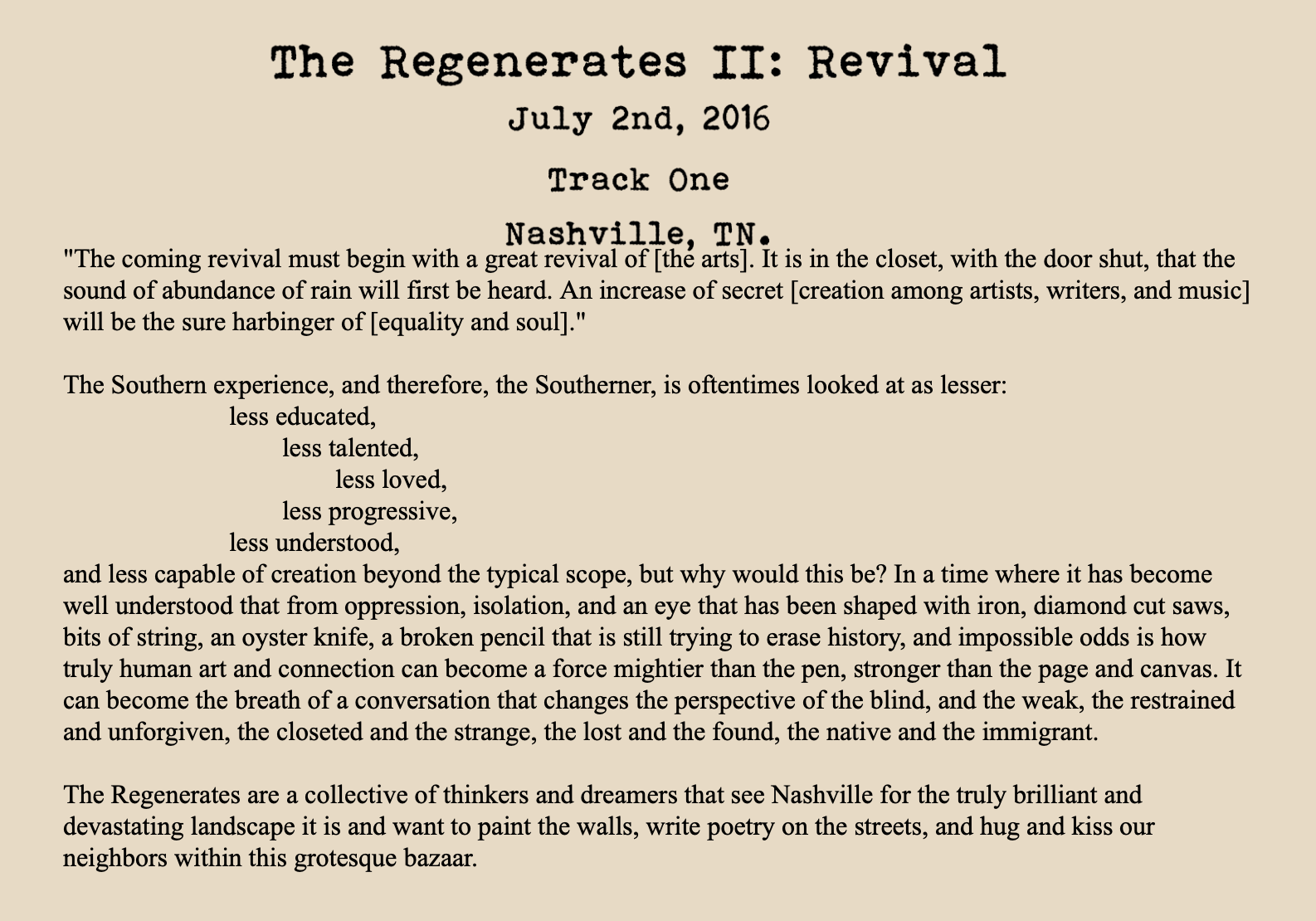 Revival, The Regenerates Art Collective at Track One, Nashville, TN